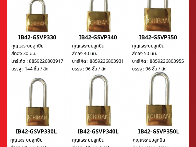 สินค้าแบรนด์ ICHIBAN มีหลากหลายรายการให้เลือกเช่น กุญแจล๊อค คีมปากจิ้งจก คีมปากแหลม ประแจเลื่อน ค้อน เป็นต้น